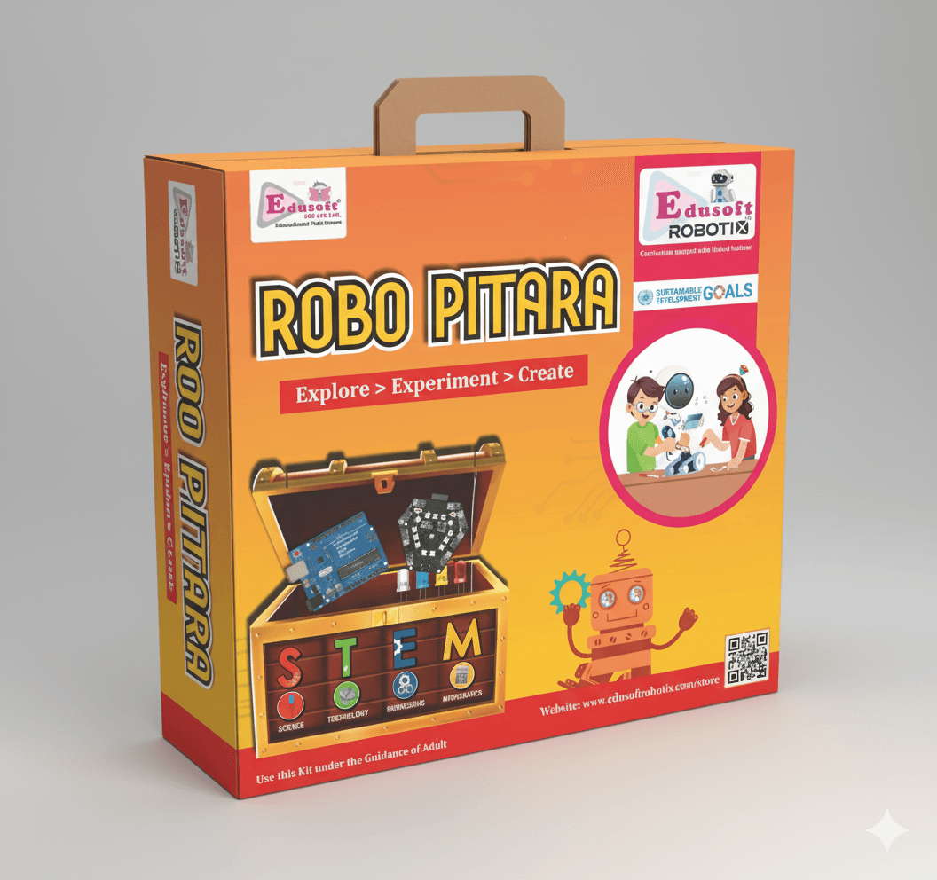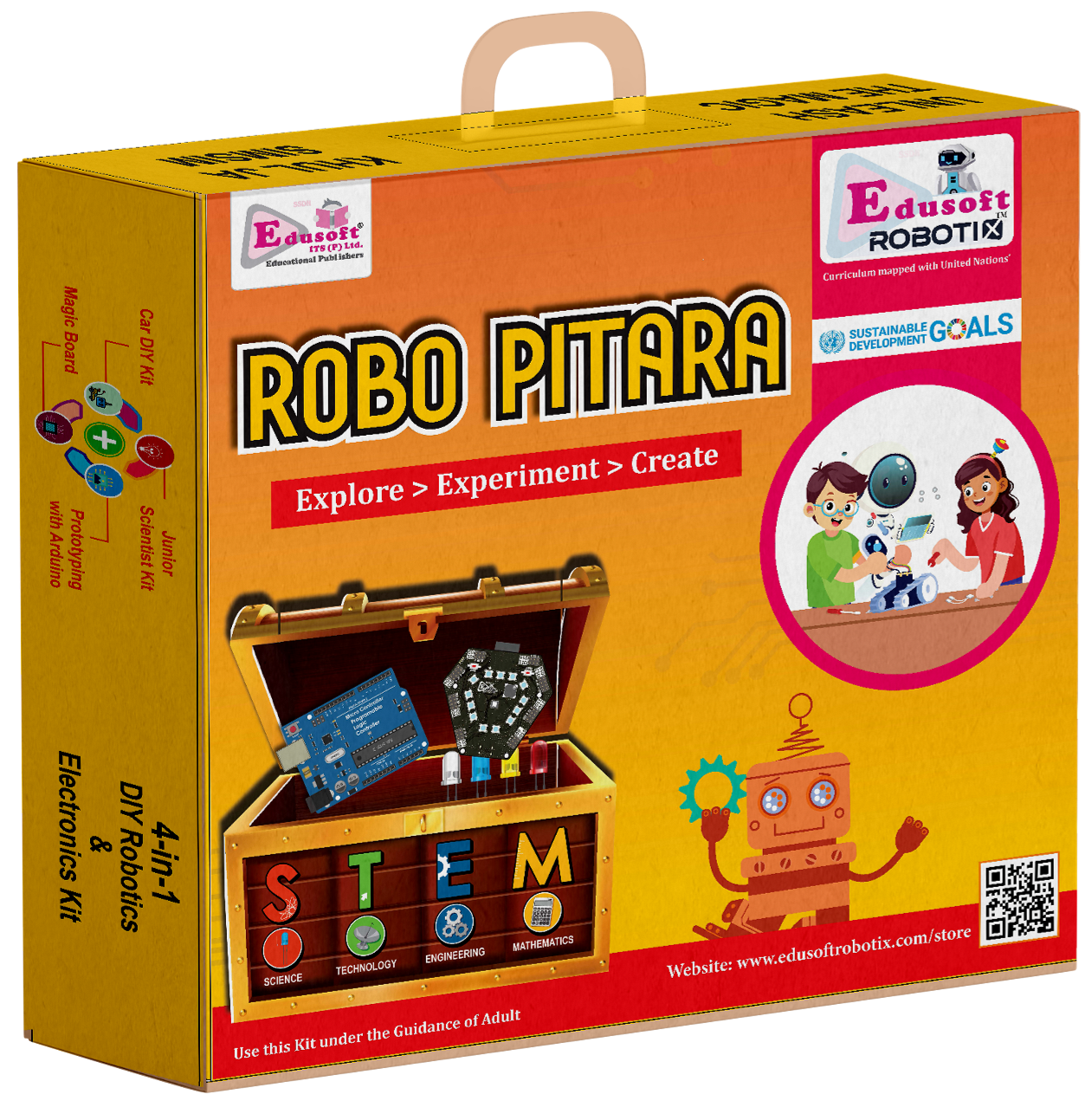 ROBO PITARA is a unique DIY learning box that combines electronics, coding, and robotics in one exciting package.